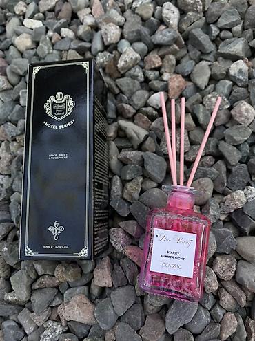 - Duo Shang «Starry Summer Night Classic» — стеклянный розово‑фиолетовый флакон с рельефом, комплект розовых ротанговых палочек.