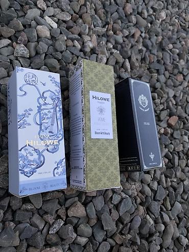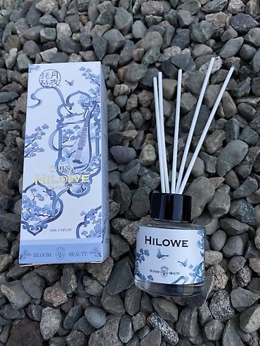 - HILOWE «Bloom Beauty» (оформление China) — флакон с черной крышкой и белыми палочками; коробка с восточным синим узором.