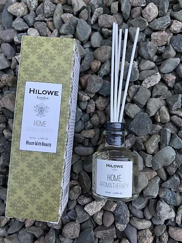 - HILOWE London «Home Aroma Therapy Bloom With Beauty» — круглый прозрачный флакон, белые палочки; оформление коробки в классическом зеленом стиле.