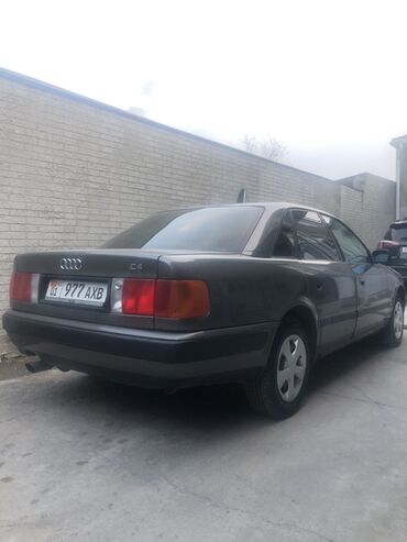 Audi 100 C4, седан, тёмно‑серый цвет. Люк есть Кузов классической формы, фирменная решётка с четырьмя кольцами, тонированные стёкла. Оригинальные колпаки, штатная оптика, боковые повторители поворотов. Задняя эмблема C4.