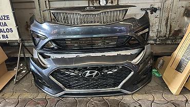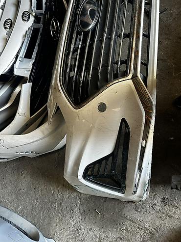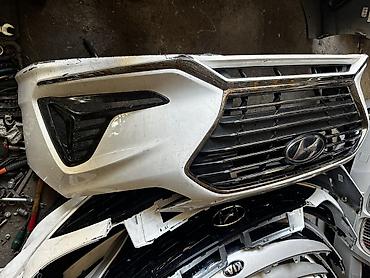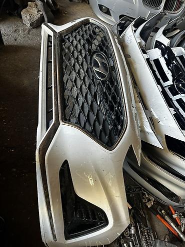 Передний бампер Hyundai Sanata 2019 год рестайлинг) с фирменной крупной решеткой радиатора.