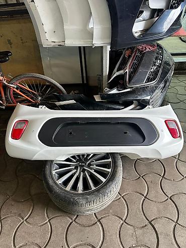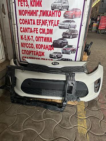 - Передний бампер: с центральной решёткой воздухозаборника, местами под ПТФ/ДХО, декоративными чёрными элементами. В комплекте лицевая накладка с эмблемой Kia и пластиковая телевизорная рамка-лонжерон (каркас) — см. фото.