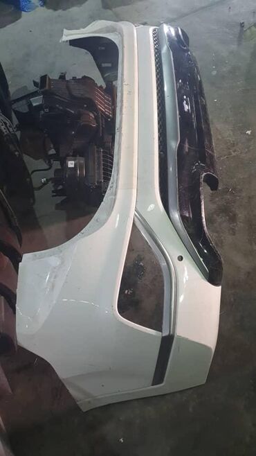 Задний бампер для кроссовера/внедорожника, цвет белый с темно‑серым нижним диффузором и черными декоративными вставками по бокам. Характеристики: - Материал: пластик (ABS/PP). - Компоновка: центра...