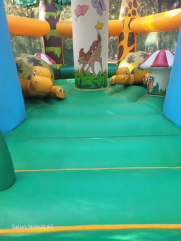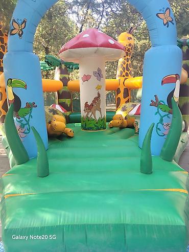 - Конструкция: просторная прыжковая площадка с высокими бортами и арочным входом; внутри — надувные фигуры-игровые элементы (грибы, черепахи, колонны).