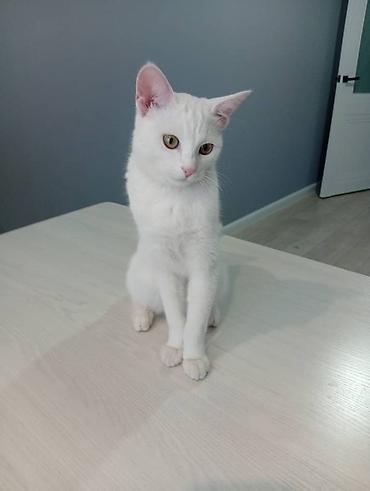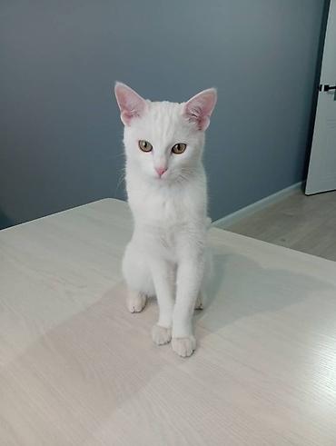 Белоснежный молодой кот с короткой шелковистой шерстью и янтарными глазами. Аккуратные розовые нос и ушки, стройное телосложение, изящные лапы. Шерсть однородная, без пятен, ухоженная; усы длинные, хвост пропорциональный.