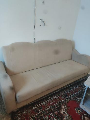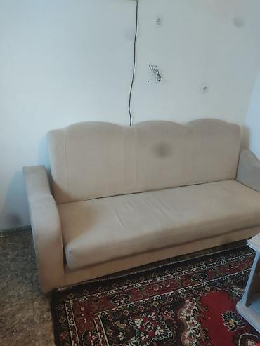 Бежевый трехместный диван со следующими особенностями:
