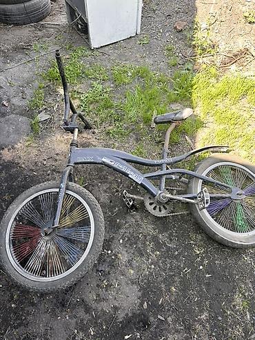BMX-велосипед с изогнутой стальной рамой и высоким рулём.