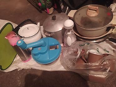 - Посуда и кухонные принадлежности: кастрюли (алюминиевые и с крышкой из жаропрочного стекла), эмалированный чайник/ковш, большой сотейник/сковорода с крышкой, кружки и мерный кувшин, термос, разделочная/сушильная зелёная подставка, ручная овощерезка/измельчитель с голубой крышкой и ручкой, пресс‑резак (для яиц/картофеля), разные контейнеры и мелкая утварь.