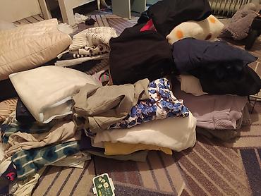 - Одежда: смешанная подборка женской/подростковой и, возможно, детской одежды — свитеры, кофты, блузки (в том числе с синим цветочным принтом), теплая стёганая жилетка/куртка, шарфы и трикотаж; светлые и тёмные оттенки, разные ткани.