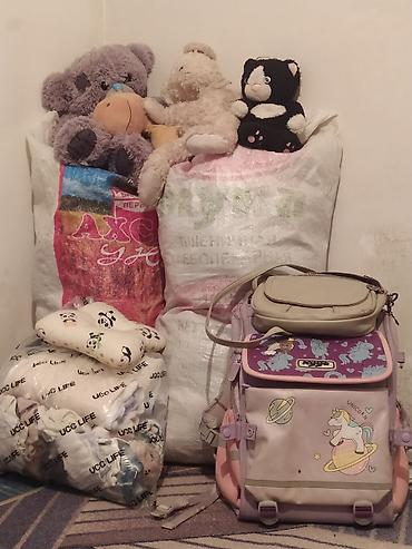 - Детские вещи и аксессуары: школьный ранец с единорогами (жёсткая спинка, карманы, светоотражающие элементы), небольшая бежево‑серая сумка через плечо, подушка для ребёнка с пандами, мягкие игрушки (медвежата, котик и др.).