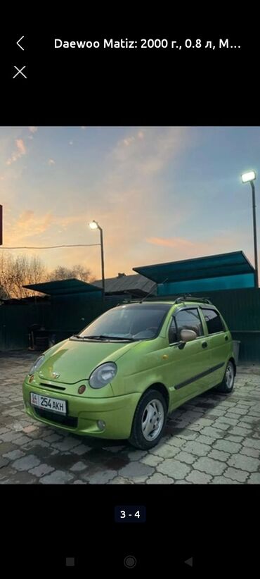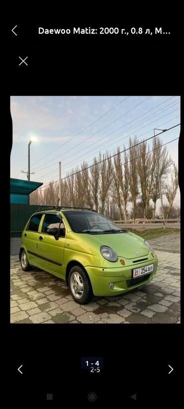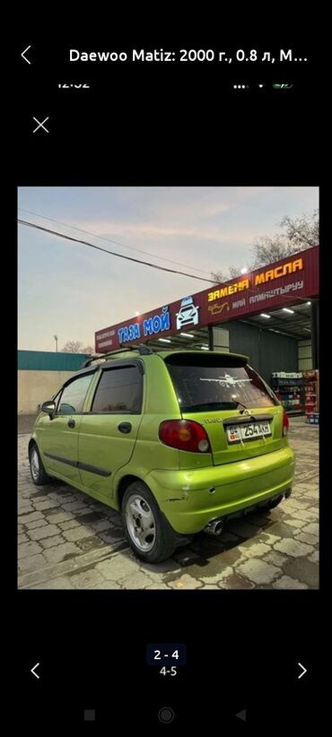 Daewoo Matiz, 2000 г. выпуска, бензиновый двигатель 0.8 л, механическая коробка передач. Пятидверный хэтчбек ярко‑зеленого цвета.