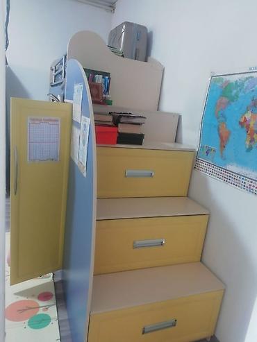 Детская двухъярусная кровать с лестницей-комодом. б/у состояние отличное находимся в Аксуу Каракол - Формат: двухъярусная конструкция с нижним спальным местом полноценной длины; верхний ярус закр...
