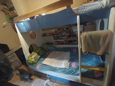 Подходит для 2 детей, экономит место в комнате, функциональные полки позволяют держать порядок у спального места. Размеры по фото: стандартная детская ширина спального места (ориентировочно под матрас около 80–90 см), длина под стандарт 190–200 см.