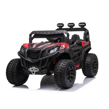 Яркий детский электромобиль багги красного цвета с чёрными элементами. Оснащён светодиодной подсветкой на передней панели и над сиденьями, что делает его заметным в любое время суток. Большие колёс...