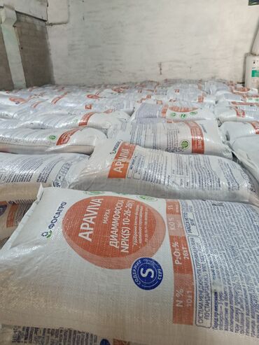 Жер семирткичтер. Минеральные удобрения в мешках по 50 кг: 1) Аммофос (азотно-фосфорное удобрение) - Маркировка: N – 10±1%, P2O5 – ≥46% 2) Калий хлористый «Уралкалий». 3) Диаммофоска APAVIVA (Фос...
