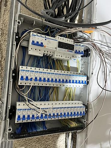 - Монтаж: выполнены шинки заземления и нулевые шины, аккуратная укладка проводов; предусмотрено место для последующего подключения кабелей сверху и снизу.