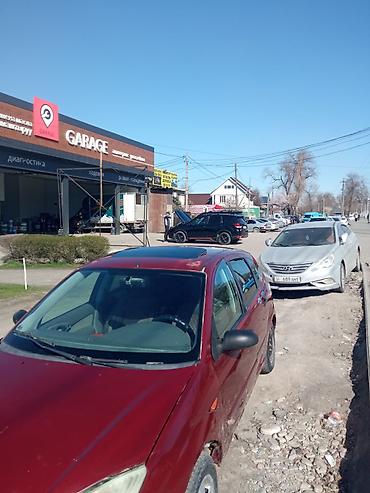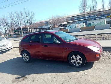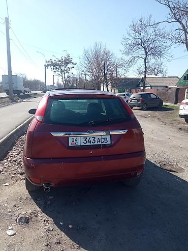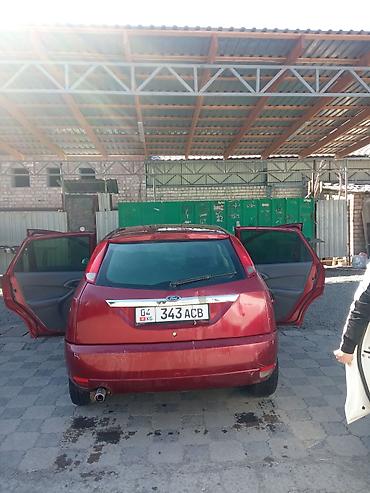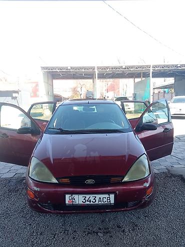 Ford Focus хэтчбек, 5 дверей, тёмно‑красный цвет. Киргизские номера (KG). Кузов с аэродинамичным дизайном, задний дворник, выхлоп с круглой насадкой, легкосплавные диски.