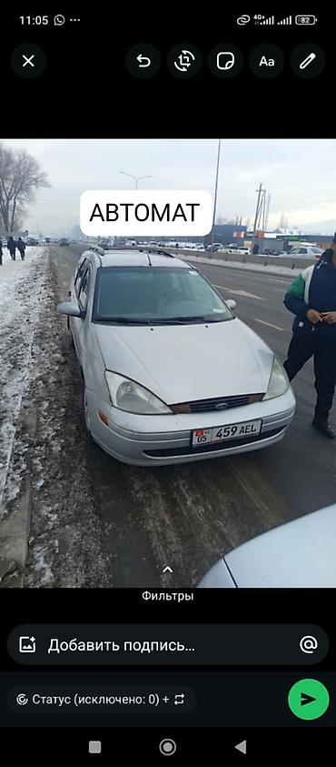 Ford Focus универсал, серебристый цвет. Коробка передач — автомат (на фото указано “АВТОМАТ”). Кузов универсал с рейлингами на крыше, легкосплавные диски. Передний привод. Фары линзованные, передние противотуманки, задний стеклоочиститель. Номерной знак KG 05 459 AEL.