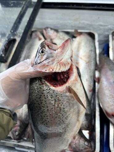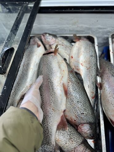 Свежая Форель одна рыба весит 1кг до 1.5 кг адрес город токмок оптом цена 550 сом Описание: - Цельные тушки с головой, чешуя серебристая, розовое мясо. - Свежая разделка: удалены внутренност...
