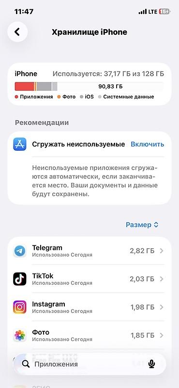 - Память: 128 ГБ (на скриншоте «Хранилище iPhone»: используется 37,17 ГБ из 128 ГБ).