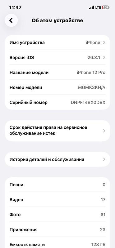 Комплектация и дополнительные сведения по фото экрана «Об этом устройстве»: модель iPhone 12 Pro, номер модели MGMK3KH/A.