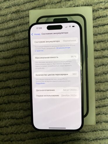 Продается iPhone 15. 1. Черный цвет 2. 128 ГБ 3. Две физические SIM-карты 4. Состояние батареи 90% 5. 481 цикл зарядки Недостатки: 1. Небольшие царапины сверху и по бокам 2. Очень небольшая трещи...
