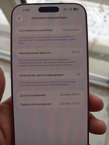 - Состояние аккумулятора по iOS: максимальная емкость 100%, количество циклов перезарядки 30.