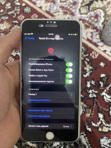 - Touch ID: работает для разблокировки, iTunes Store и App Store, Wallet и Apple Pay, автозаполнение паролей (все тумблеры активны на скриншоте)