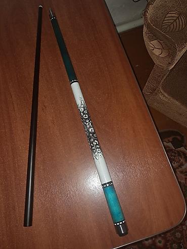 - Разборный кий из двух частей: турняк с резьбовым соединением и шафт с наклейкой (на фото виден белый сук на наконечнике).