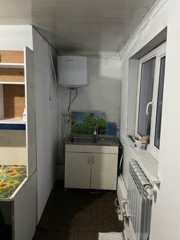 - Кухонный уголок: напольная тумба с мойкой, смеситель, электрический водонагреватель, рабочие поверхности, окно. Радиатор отопления у окна.