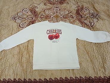 - Свитшот молочный «Cherries»: светлый базовый цвет, спереди яркий принт с вишнями и надписями. Прямой силуэт, круглая горловина, длинные рукава, мягкий трикотаж, манжеты и нижняя резинка.