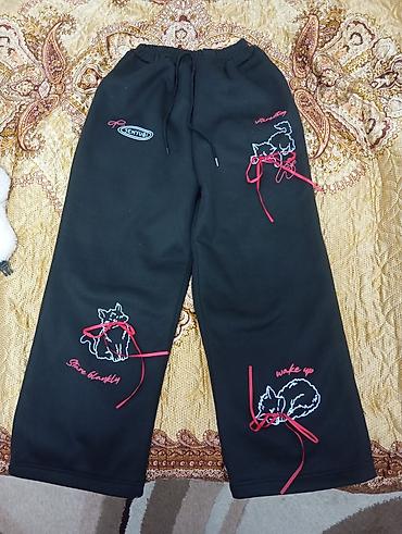 - Брюки чёрные трикотажные: свободный прямой крой, резинка на талии со шнурком, несколько контурных принтов котиков и вышитые надписи, декоративные красные ленты-банты, удобные для повседневной носки.