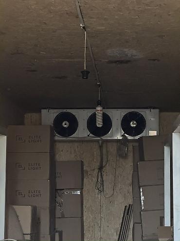- Установлен промышленный холодильный испаритель с тремя вентиляторами (моноблок/сплит — внутренняя часть на фото). Электроподвод выполнен, потолочная разводка под освещение.