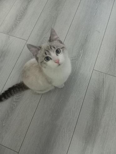 Котёнок с ярко-розовым носиком и выразительными голубоватыми глазами. Окрас поинтовый: светлое кремово-белое тело, серо-пепельные уши и маска, тёмно-полосатый хвост. Мягкая короткая шерсть, аккуратные белые лапы. Компактное телосложение, пропорциональная голова с чёткими тёмными отметинами над глазами. Спокойный, ориентирован на человека, легко идёт на контакт, внимательно реагирует на голос. Подходит для домашнего содержания в квартире: аккуратен, любопытен, любит сидеть рядом и наблюдать. Отличный друг для семьи, создаёт уют и быстро привыкает к новому пространству.