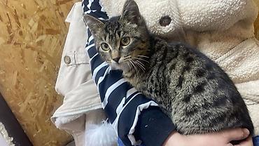 Домашний кот с выразительным тигровым окрасом (короткая шерсть, чёткие тёмные полосы). Большие янтарные глаза, аккуратные уши, крепкое телосложение. Ласковый и контактный: спокойно даётся на руки, ...