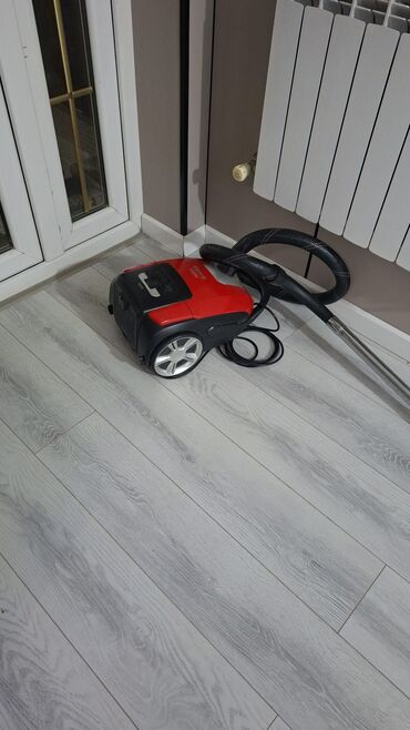 - Корпус красно‑черного цвета на больших колесах для удобного перемещения