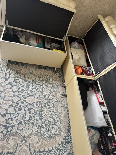 - Хранение: под каждой сидушкой поднимающиеся крышки на металлических петлях/газлифтах, внутри вместительные короба для кухонных принадлежностей, текстиля и т. п.
