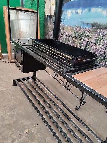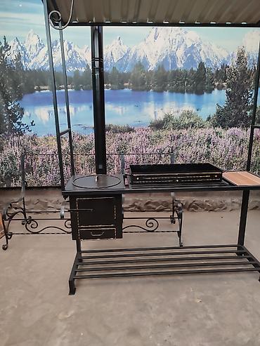 барбекю зона тумбочка глубина 50 ширина 50 высота 74 затем идёт мангал чашка съёмная металл тройка 70 сантиметров на 30 сантиметров есть прорези для палочек очень удобно затем печка небольшая с кол...