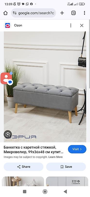Также на изображениях пример другой модели банкетки: обивка микровелюр, каретная стяжка, на деревянных ножках; ориентировочные габариты ?48 см. Подходит как декоративная и функциональная скамья у стены/в прихожей.