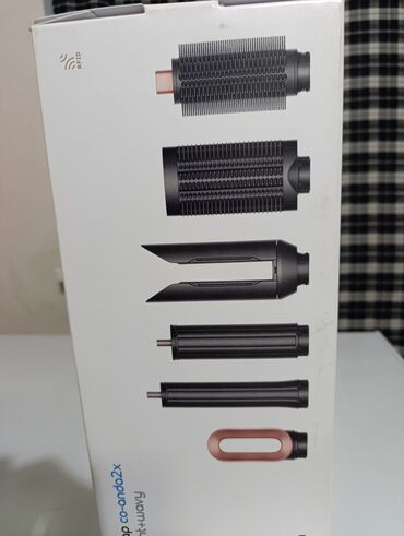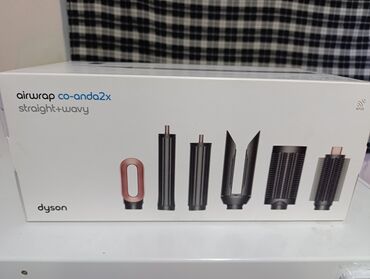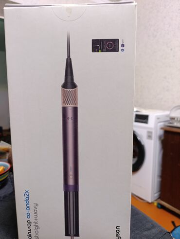 Подходит для прямых и волнистых волос, позволяет делать как гладкие укладки, так и упругие локоны. Бренд: Dyson. Модель: Airwrap Coanda 2x Straight + Wavy. Цветовая схема корпуса и насадок — фиолетово-черная с медными акцентами.