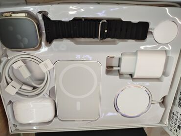 Подходит для ежедневного использования: часы для уведомлений и спорта, TWS‑наушники для музыки и звонков, беспроводные зарядные устройства для телефона и часов, сменные ремешки для разных сценариев. Все компоненты аккуратно уложены в фирменные боксы.