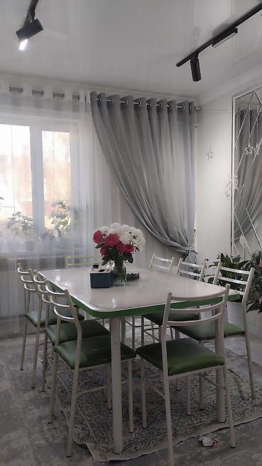 Комплект продается целиком: стол + 8 стульев. Цветовая гамма: светлый стол, зеленые акценты. Идеально для семейных обедов и приема гостей.