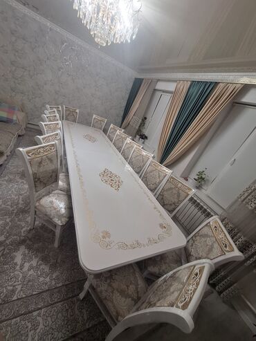 ПрямоугольныйБольшой обеденный стол с двенадцатью стульями. Стол прямоугольной формы с белой глянцевой столешницей, украшенной золотистым цветочным орнаментом. Ножки стола и каркасы стульев выполнены в белом цвете с золотистой отделкой. Стулья с мягкими сиденьями и спинками, обтянутыми тканью с узором в бежевых и золотистых тонах. Подойдет для большой семьи или для приема гостей.