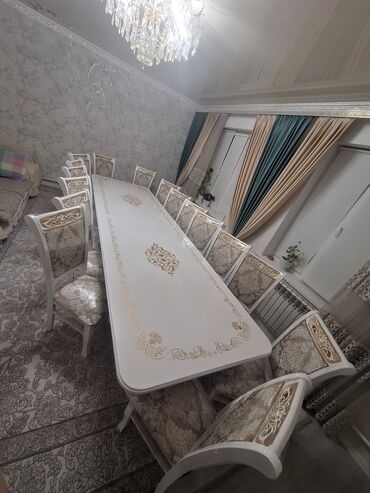 Большой обеденный стол с белой глянцевой столешницей и комплектом из 16 стульев с мягкой обивкой. Ножки стола и каркасы стульев выполнены в светлых тонах с золотистыми декоративными элементами. Сто...