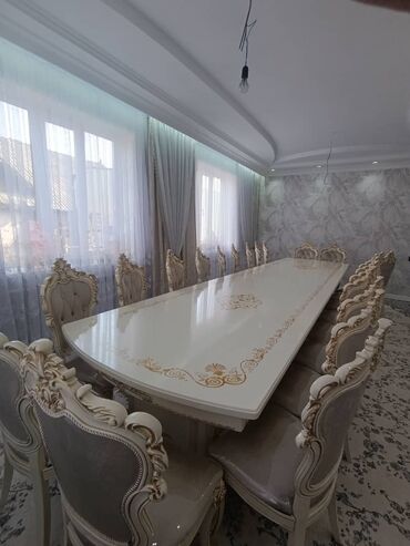 Большой обеденный стол с резным декором и двенадцатью стульями в комплекте. Стол имеет прямоугольную форму с овальной вставкой в центре столешницы. Стулья с мягкой обивкой и резными спинками выполн...