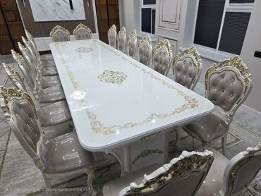 Предлагается большой обеденный стол с белой глянцевой столешницей, украшенной золотистым орнаментом. Стол имеет массивные резные ножки, также декорированные золотом. Он идеально подойдет для просто...