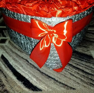 - Оформление: плотный картон с бело‑черным принтом надписей, декорирована широкой атласной лентой и большим красным бантом