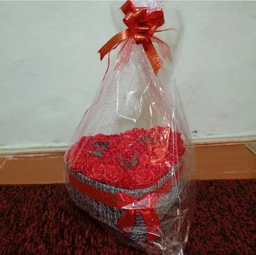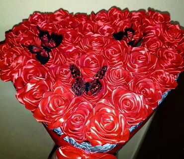 - Наполнение: плотно уложенные декоративные атласные розы насыщенно‑красного цвета