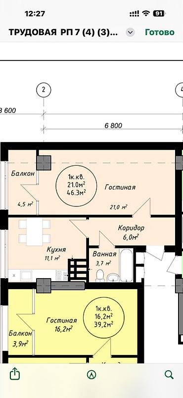 1-комнатная квартира в новостройке. Планировка: общая площадь 46,3 м², жилая комната 21,0 м², кухня 11,1 м², коридор 6,0 м², ванная 3,7 м², балкон 4,5 м².