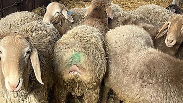 Продаются овцы с ягнятами (мамки с приплодом). На фото — несколько маток и молодняк разного окраса (белые, пятнистые, серые, бурые). У животных длинные свисающие уши, крепкие ноги, плотный настриг ...